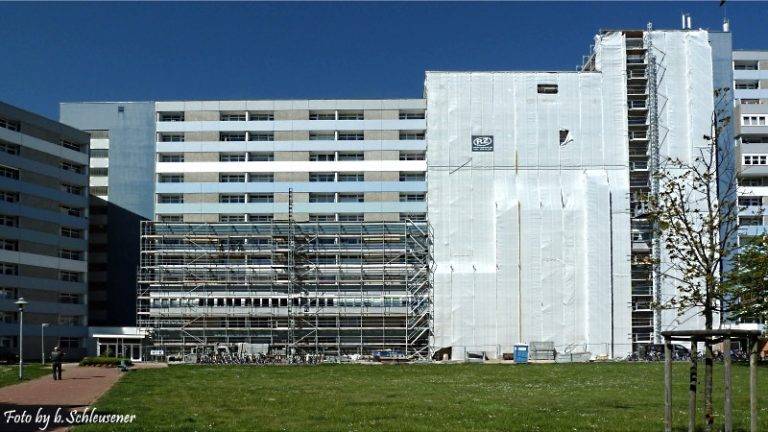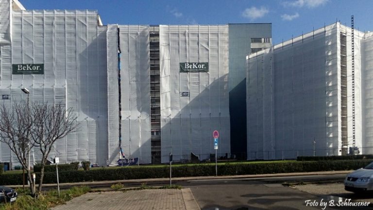 Hier sehen Sie einige Fotos der Sanierungsarbeiten. Das linke Bild zeigt einen komplett verhüllten Bauabschnitt, das rechte Bild deutet das Ende des 5. Bauabschnittes an. Während Haus H schon halb abgerüstet wurde, ist Haus G noch komplett verhüllt.