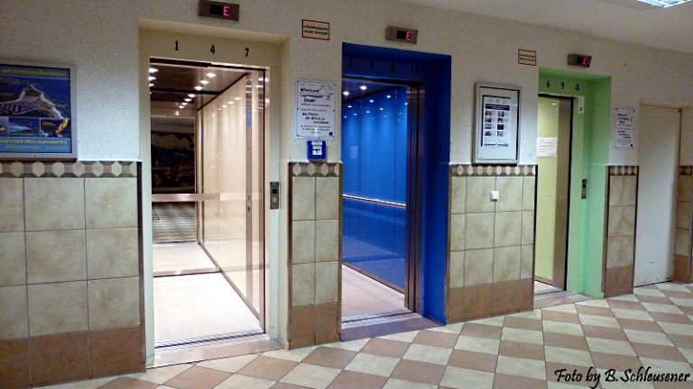 Die Aufzüge sind farblich unterschieden, damit Kinder leichter die richtige Etage finden können.