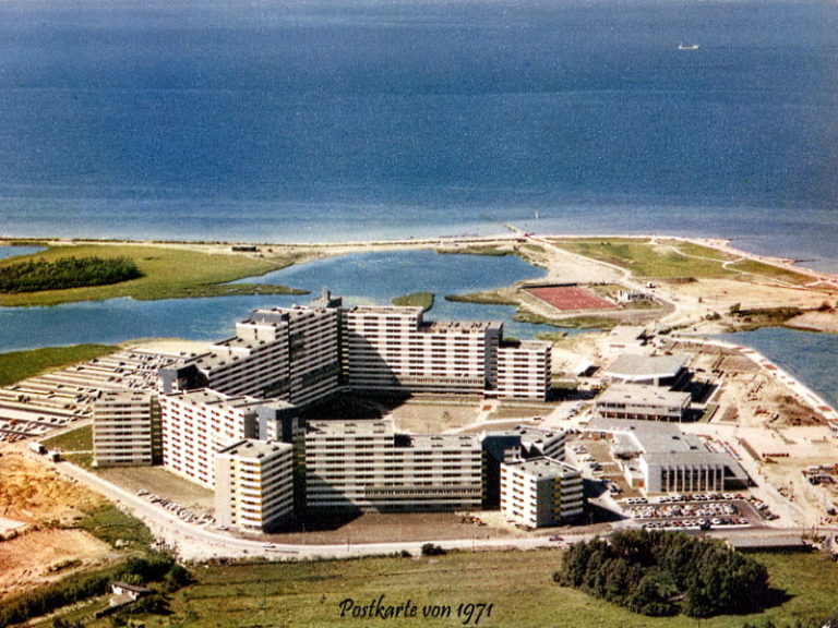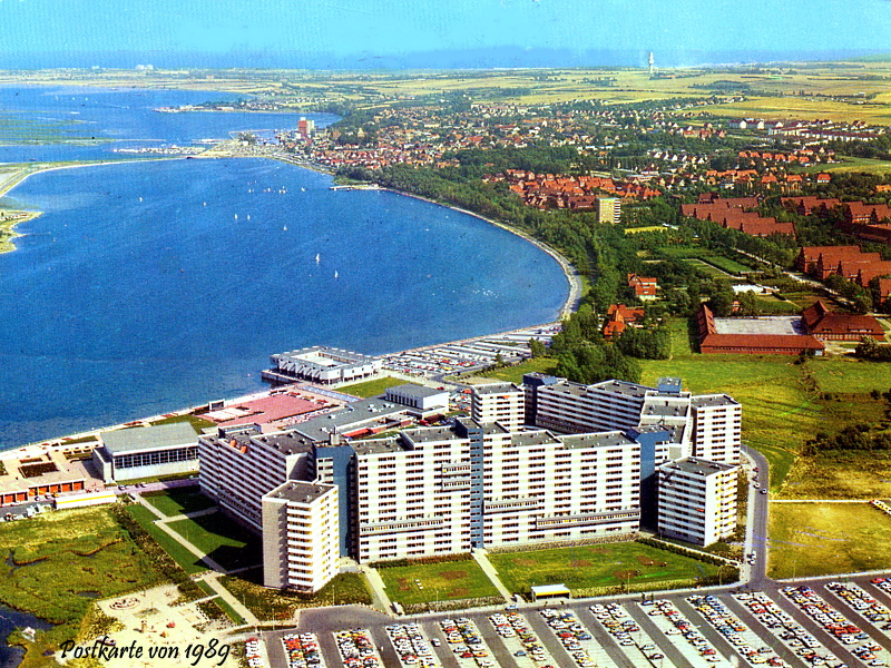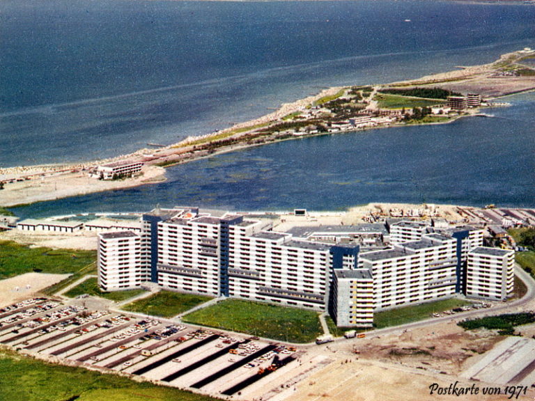 Auf den folgenden Postkarten aus dem Jahr 1971 sehen Sie einige Luftaufnahmen in der Bauphase. Der Parkplatz, das Haus des Kurgastes, der Pavillon und die Gartenanlage sind noch nicht fertiggestellt. Der Steinwarder ist noch so gut wie unbebaut.
