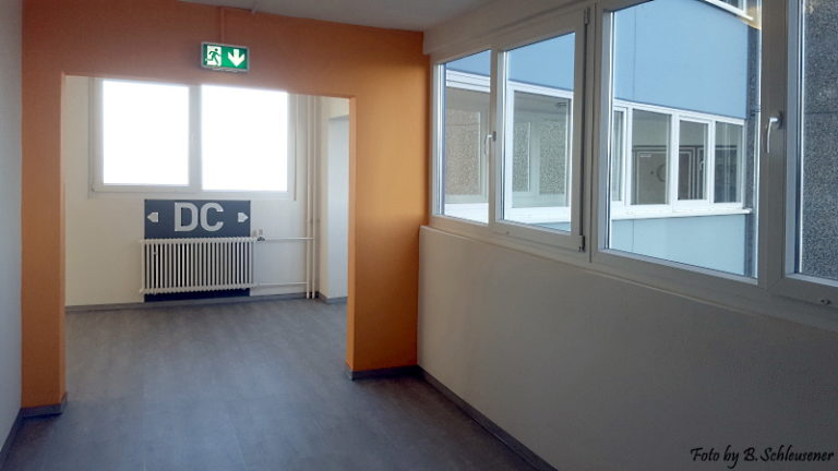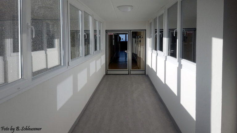 Im rechten Bild sehen Sie eine der hellen und sonnendurchfluteten Übergangsbrücken, die zu den Satellitenhäusern führen. Auch hier wurde die matte Industrieverglasung durch neue Fensterelemente ersetzt.